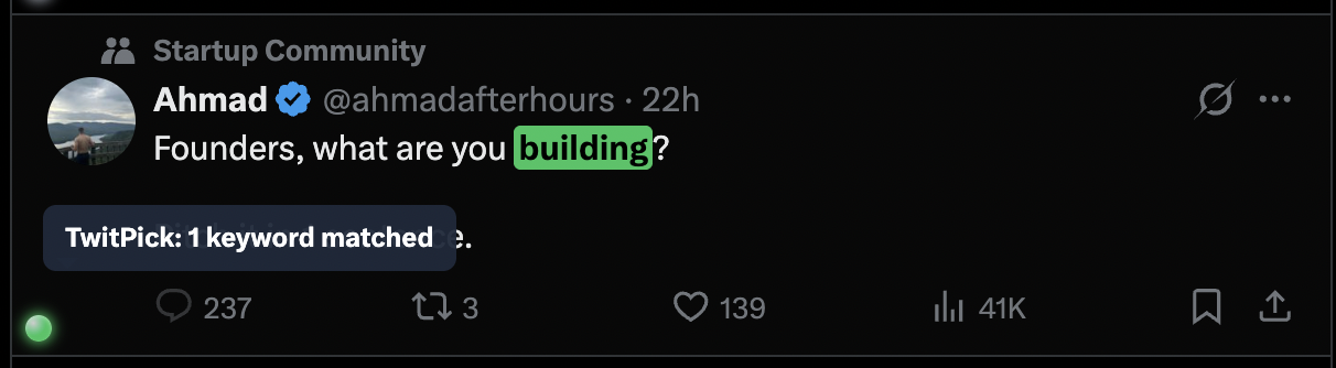 The posts that actually matter to you — your keywords, your topics — scroll past unnoticed in a sea of random timeline content. No phrase matching, no multi-keyword filtering, no visual signal that says "this one's for you."