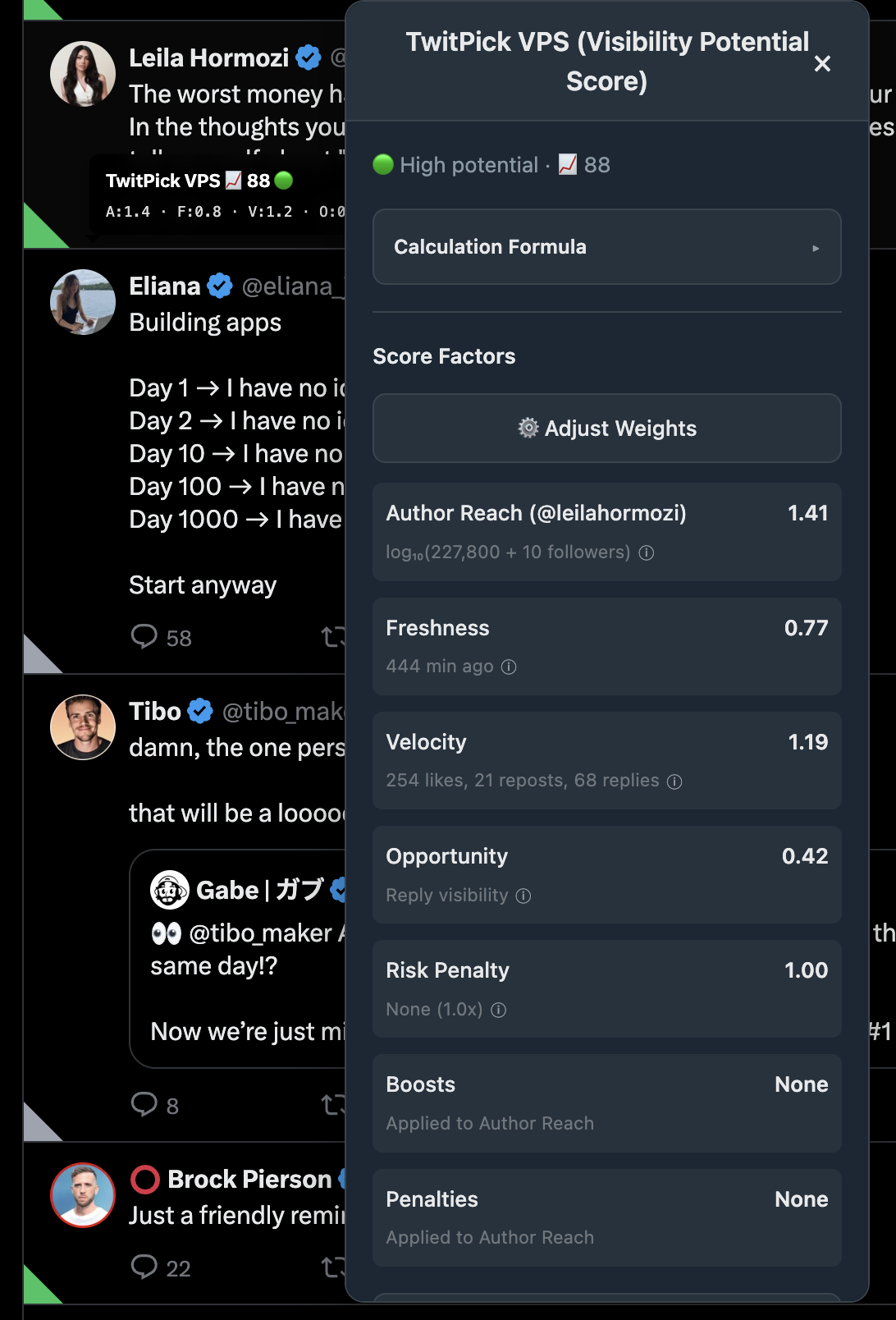 Every tweet gets a color-coded score based on author reach, freshness, velocity, and more. Green means high potential — gray means skip it.