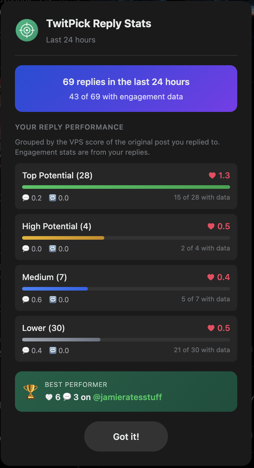 You craft a thoughtful reply to a tweet that looked promising. Twenty minutes later — 0 impressions. The author had 50 followers and posted at 2 AM. Your reply vanished. There was no way to know.